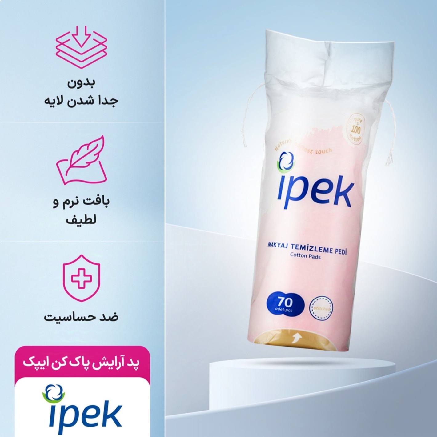 پد آرایشی ایپک 70 عددی گزینهای اقتصادی و کاربردی برای استفاده روزانه است که به راحتی آلودگیها و آرایش را از پوست پاک کرده و پوست را تمیز و شاداب نگه میدارد، بدون ایجاد تحریک یا خشکی.